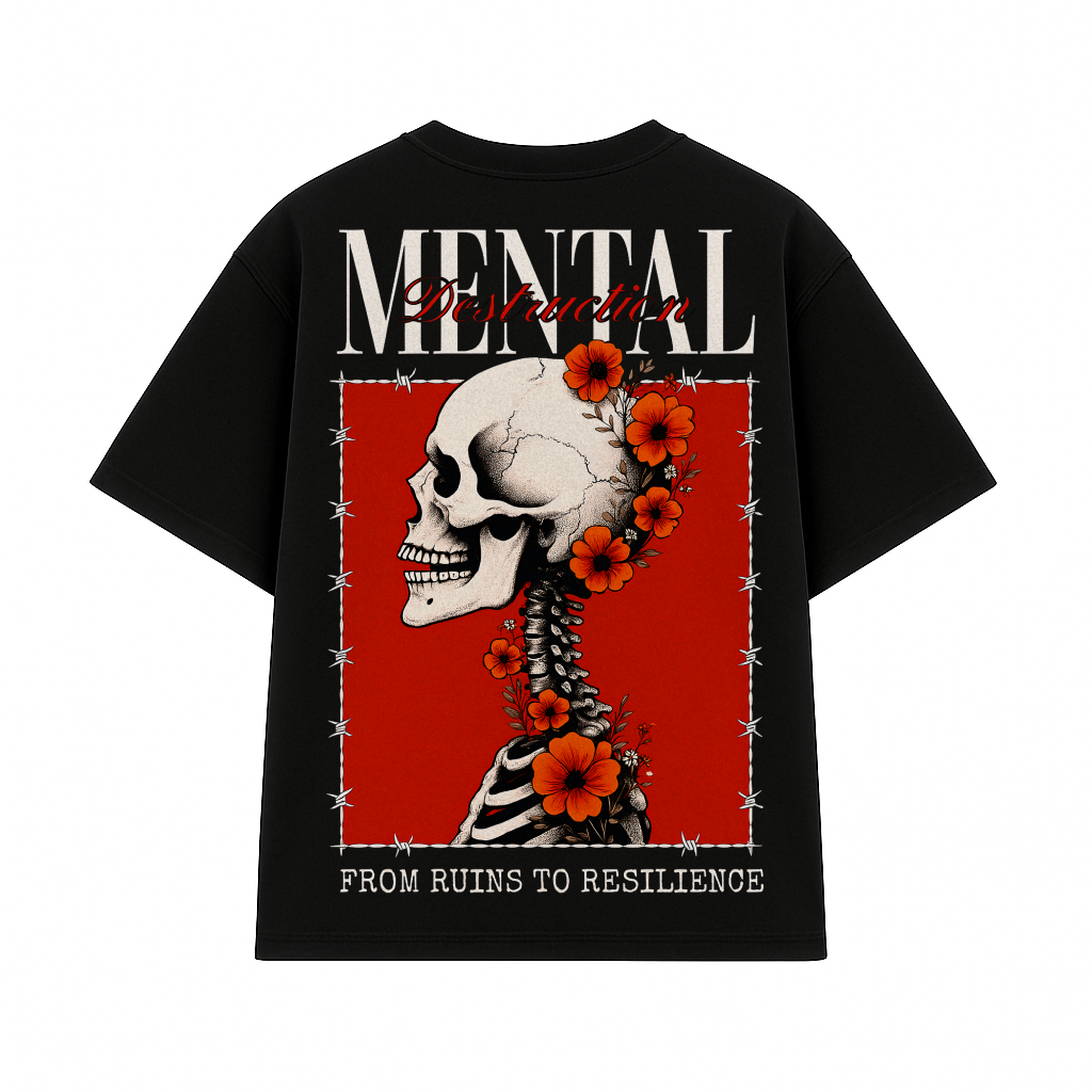 The Resilience Oversized Tee symbolizes strength through struggle. A bold skull-and-floral artwork with ‘From Ruins to Resilience’, crafted in 240 GSM heavyweight cotton for true streetwear presence.